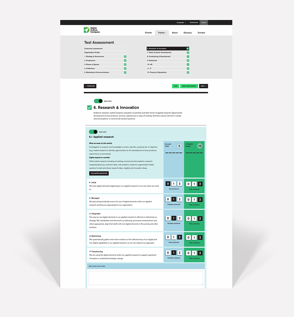 The Tracker is a comprehensive and detailed self-assessment tool divided into a number of sections covering all areas of digital culture. It is targeted towards the arts, culture and heritage sectors with the aim being to help improve digital activities and bring organisations into the digital age, in a steady and informative manner. The hopes being that organisations will refer back to the tool year after year to keep track of how they are managing their digital presence and find areas in which they could improve on.