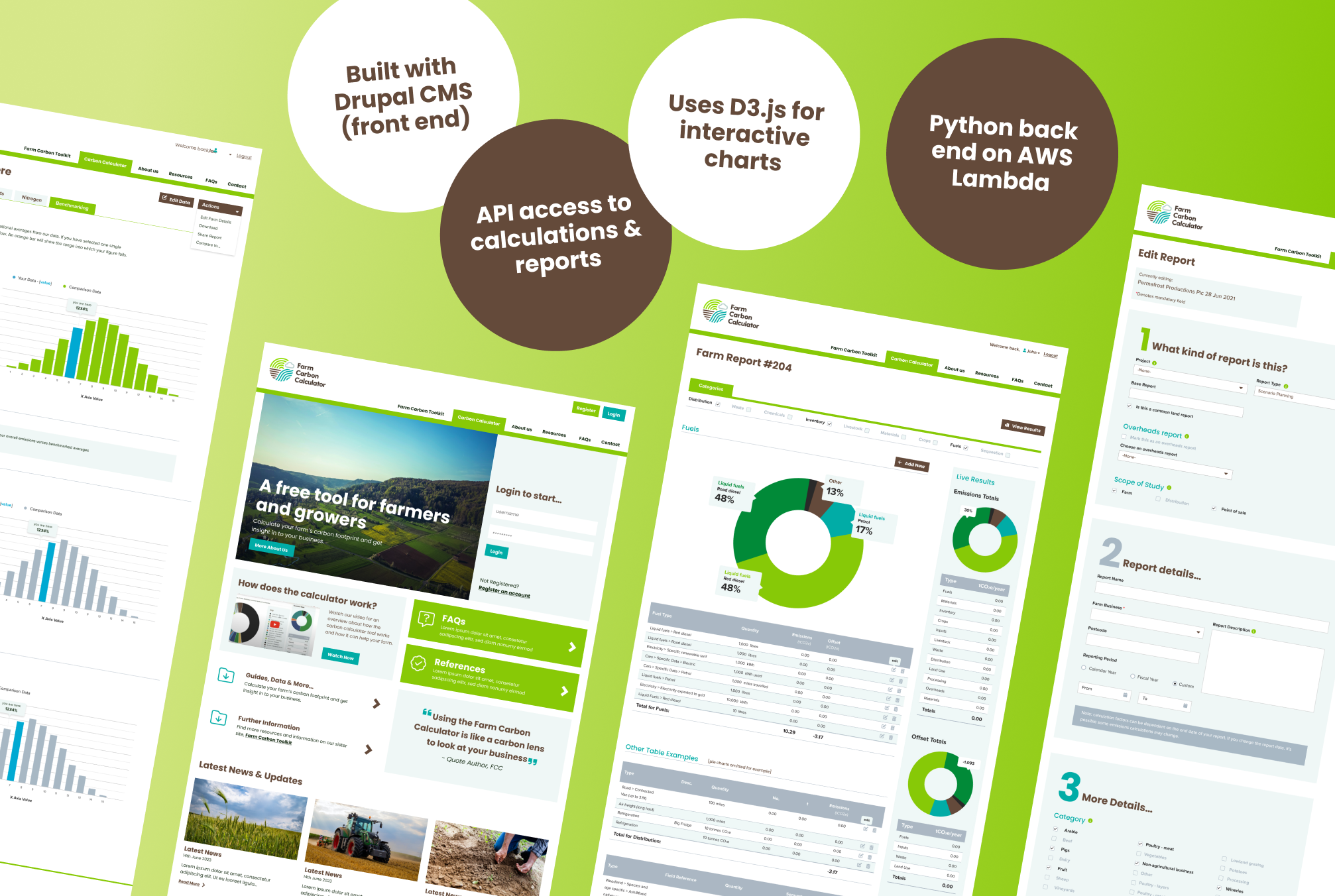 We built the website and calculator in the latest version of the Drupal content management system, keeping in mind the Farm Carbon Toolkit brand with the use of colour and layout. The site is easily navigable with clear instructions on how to use the tool as well as how to collect farm data and what sorts of data can be used. The design of the tool is structured and coherent to make the process of adding data as straightforward as possible while giving the farmers as much data as they need.
